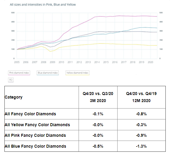 The Fancy Color Research Foundation (FCRF) announced today the Fancy Color Diamond INDEX results for Q4 and a summary of 2020.