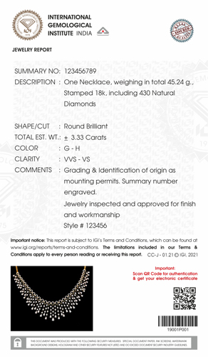 The latest version of the IGI Jewelry Report exhibits exceptional security features that can assist both jewelers and end consumers to evaluate and understand the jewelry better. Security and convenience being the core aspects, the report elevates the fine jewelry retail experience to a whole new level. Features like the bar code and the QR code makes the report an easily accessible description of the jewelry.
