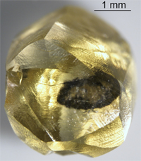 Rough diamond from Zimmi in West Africa, near the Sierra Leone-Libera border. It contains a sulfide inclusion with compositions that give clues to how the West African continent formed.