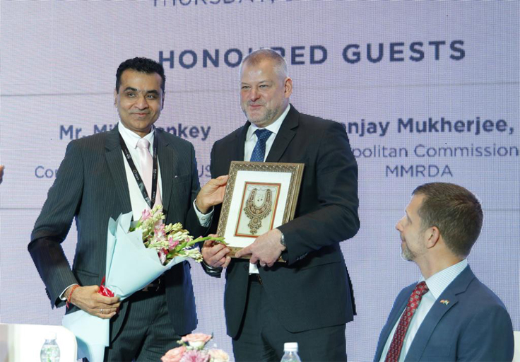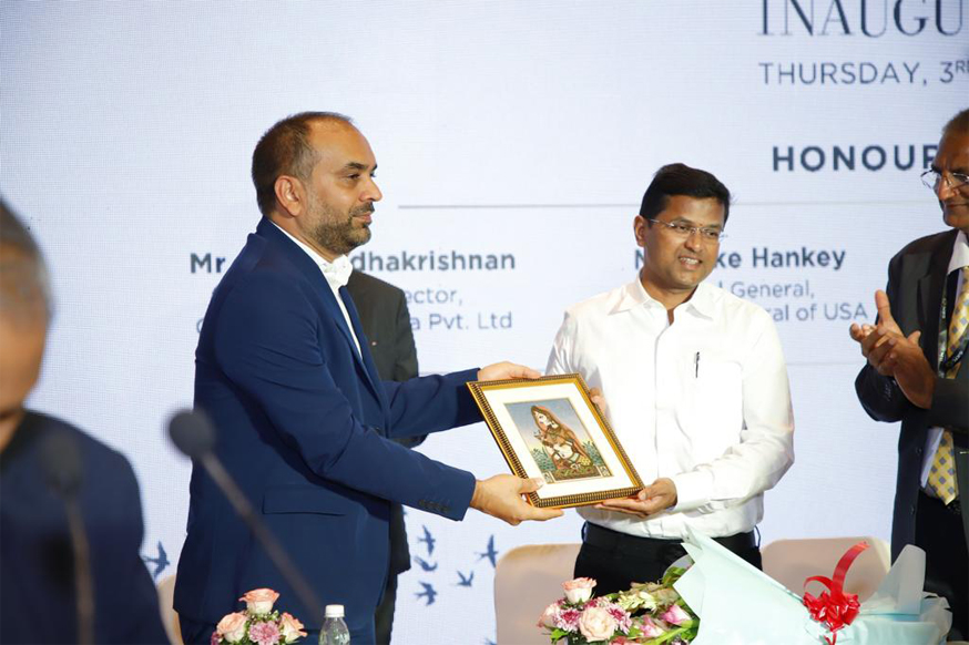 Mr. Vipul Shah, Chairman, GJEPC, felicitates Mr. Mike Hankey, Consul General, Consulate General of USA; during the inauguration of IIJS Premiere organised by the Gem & Jewellery Export Promotion Council (GJEPC) at JIO World Convention Centre