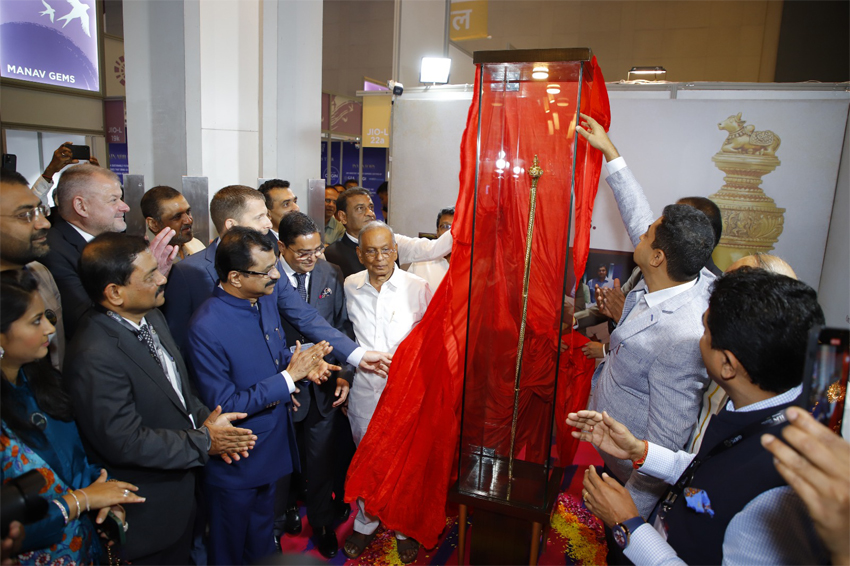 IIJS Premiere 2023 showcases a Sengol crafted by The Vummidis symbolising a powerful reminder of sovereignity, justice and unity and signifying transfer of power from the British to India being displayed at the JIO World Convention Centre. IIJS Premiere is organised by the Gem & Jewellery Export Promotion Council (GJEPC) at JIO World Convention Centre