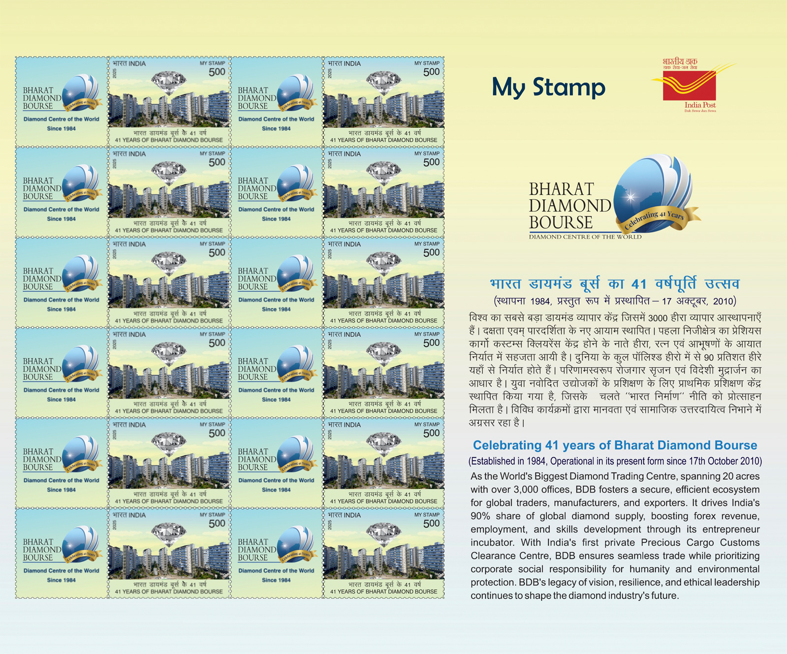 Mr. Mehul Shah, Vice President, Bharat Diamond Bourse, added: “As we celebrate 15 years of BDB Complex operations & 41 years of BDB - It's the stamp of Excellence, our focus remains on innovation, sustainability, and strengthening India’s global footprint.The stamp release is a tribute to every member who contributed to making BDB a beacon of excellence. A special mention here to the Small & Medium enterprises housed within BDB for their valuable contribution”.