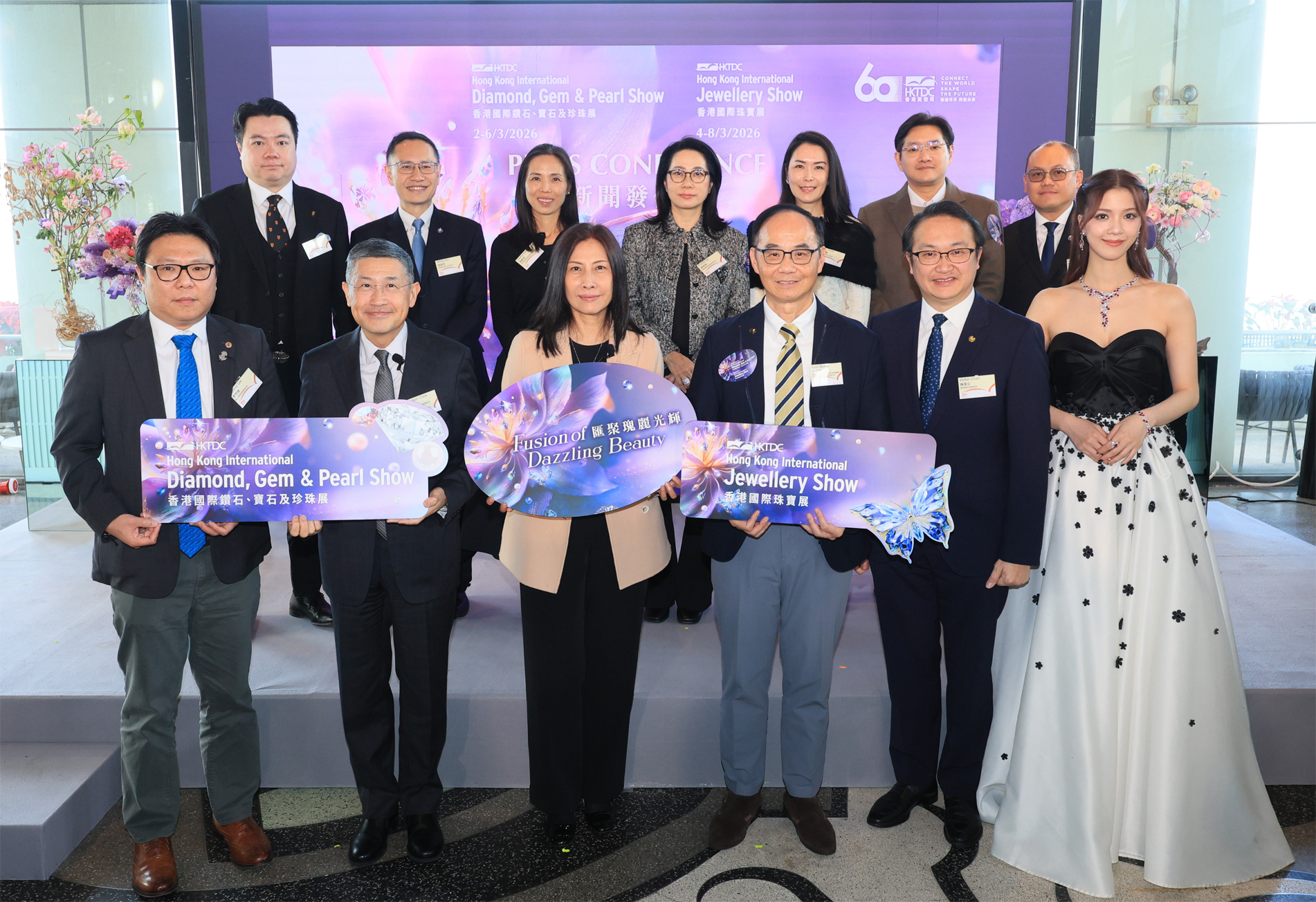 Jenny Koo (front row, third left) took a group photo with members of the organising committee of the HKTDC Hong Kong International Jewellery Show and the Hong Kong International Diamond, Gem and Pearl Show, joined by celebrity guest